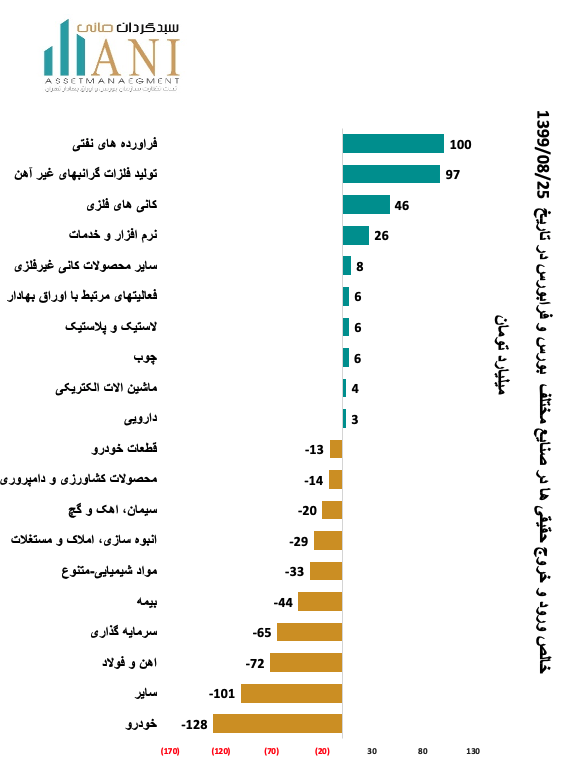 در پایان روز معاملاتی 99/08/25 صنایع فراورده های نفتی و تولید فلزات گرانبهای غیر آهن به ترتیب با 100 و 97 میلیارد تومان بیشترین ورود پول توسط حقیقی ها را داشته اند.