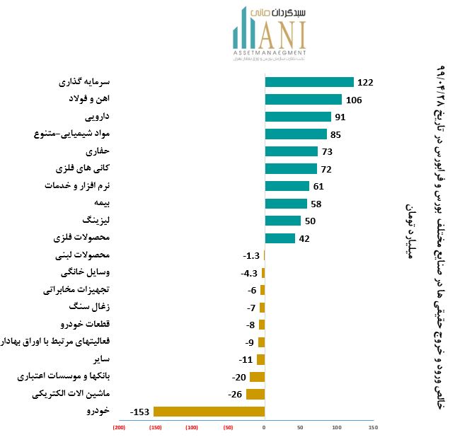 در پایان روز معاملاتی 99/04/28 صنایع، سرمایه گذاری ،آهن و فولاد و دارویی به ترتیب با 122, 106 و 91 میلیارد تومان بیشترین ورود پول توسط حقیقی ها را داشته اند.