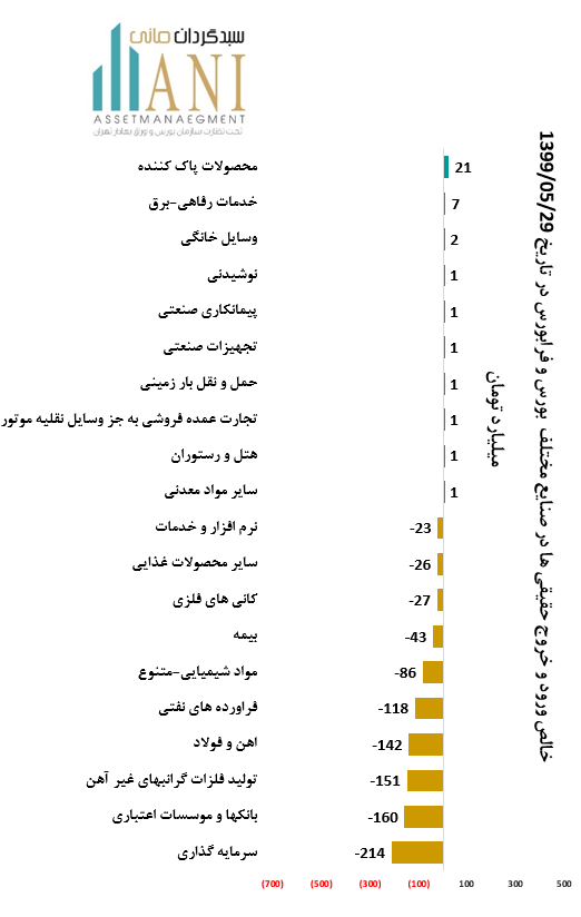 در پایان روز معاملاتی 99/05/29 صنایع، محصولات پاک کننده , خدمات رفاهی-برق و وسایل خانگی به ترتیب با 21, 7 و 2میلیارد تومان بیشترین ورود پول توسط حقیقی ها را داشته اند.