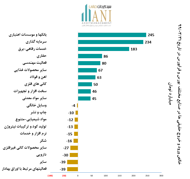 در پایان روز معاملاتی 99/03/31 صنایع، بانک ها، سرمایه گذاری و خدمات رفاهی برقی به ترتیب با 245, 234 و 183 میلیارد تومان بیشترین ورود پول توسط حقیقی ها را داشته اند.