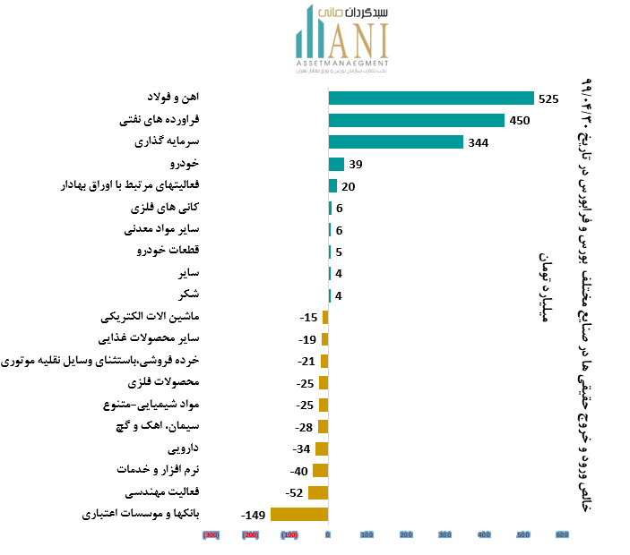 در پایان روز معاملاتی 99/04/31 صنایع، آهن و فولاد،فراورده های نفتی و سرمایه گذاری به ترتیب با 525, 450و 344 میلیارد تومان بیشترین ورود پول توسط حقیقی ها را داشته اند.