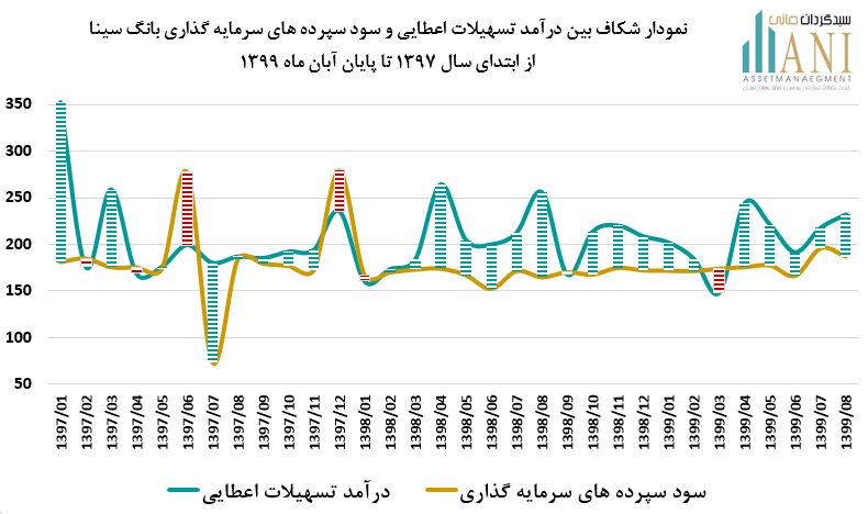 نمودار شکاف بین درآمد تسهیلات اعطایی و سود سپرده های سرمایه گذاری بانک سینا از ابتدای سال 1397 تا پایان آبان ماه 1399