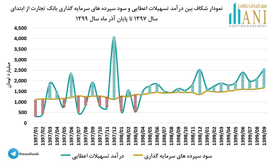 شکاف بین درآمد تسهیلات اعطایی و سود سپرده های سرمایه گذاری بانک تجارت در آذر ماه سال 1399 حدود 897 میلیارد تومان بوده است.