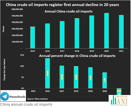 به گزارش رویترز، واردات نفت خام چین در سال 2021 میلادی برای نخستین بار از سال 2001 میلادی با افت همراه شده است. دولت چین از پالایشگاههای این کشور خواسته است تا تولید داخلی سوخت را محدود کنند.