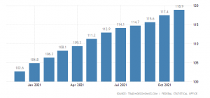 قیمت سنگ معدن، فلزات و محصولات فلزی نیمه تمام 60.3 درصد. چوب خام و اره شده 41.1 درصد ؛ و غلات، تنباکوی خام، دانه ها و خوراک دام (30.3 درصد) افزایش نشان می دهد. به صورت ماهانه، قیمت عمده فروشی 1.3 درصد افزایش داشته است.