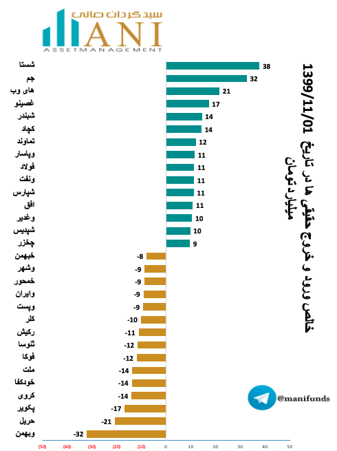 در پایان روز معاملاتی 99/11/01 شرکت های سرمایه گذاری تامین اجتماعی و پتروشیمی جم به ترتیب با 38 و 32 میلیارد تومان بیشترین ورود پول توسط حقیقی ها را داشته اند.