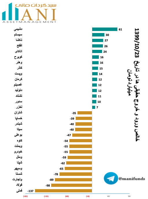 در پایان روز معاملاتی 99/10/23 شرکت های شیمی داروئی داروپخش و همکاران سیستم به ترتیب با 61 و 30 میلیارد تومان بیشترین ورود پول توسط حقیقی ها را داشته اند.