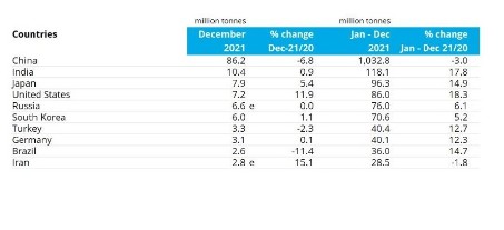 این گزارش نشان می دهد چین با تولید 1032 میلیون تن بزرگترین تولیدکننده فولاد در سال 2021 بوده است. هند با 118 میلیون تن و ژاپن با 96 میلیون تن به ترتیب در رتبه های دوم و سوم از این نظر قرار گرفته اند.