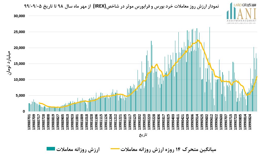 ارزش معاملات خرد سهام در بورس و فرابورس در پایان روز معاملاتی 1399/09/05حدود 16،703 میلیارد تومان بوده که حدود 5،703 میلیارد تومان از میانگین 14 روز گذشته این شاخص (حدود 11،000 میلیارد تومان) بیشتر بوده است.