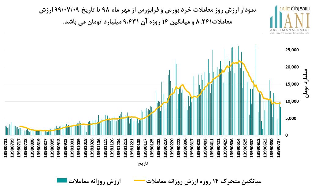 در پایان روز معاملاتی 99/07/09 ارزش معاملات خرد سهام در بورس و فرابورس(IREX)، حدود 8،241 میلیارد تومان و میانگین 14 روز گذشته این شاخص حدود 9،365 میلیارد تومان بوده است.