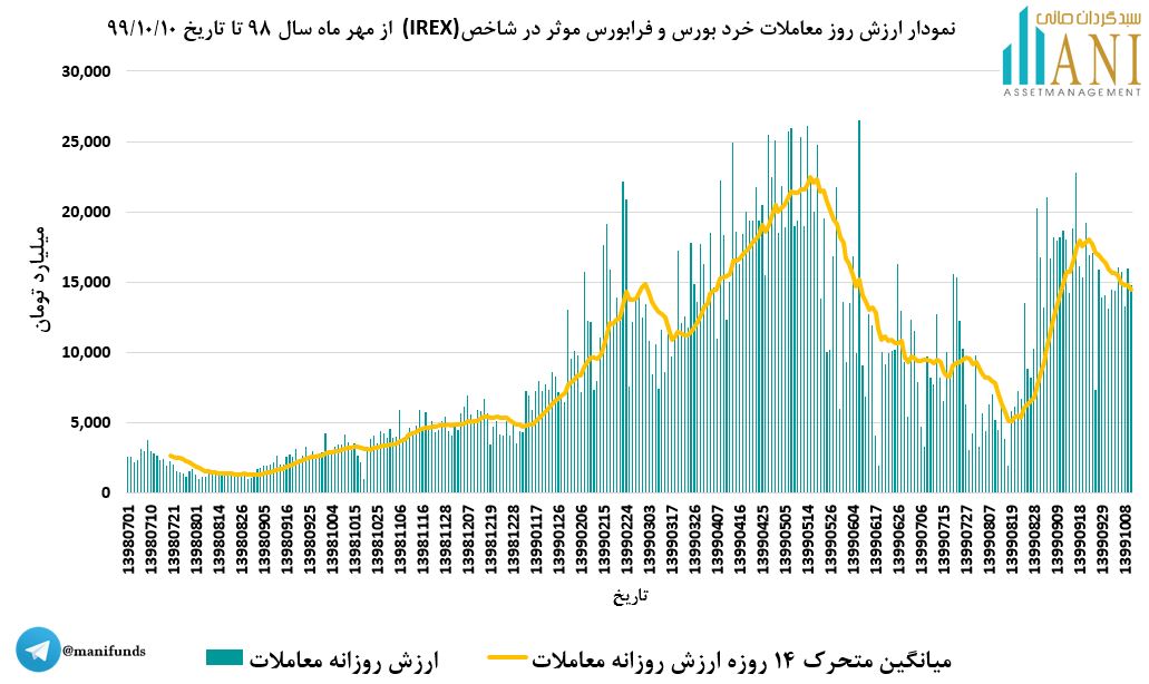 در پایان روز معاملاتی 99/10/10 ارزش معاملات خرد سهام در بورس و فرابورس موثر در شاخص(IREX)، حدود 14،772 میلیارد تومان که حدود 275 میلیارد تومان از میانگین 14 روز گذشته این شاخص (حدود 14،498 میلیارد تومان) بیشتر بوده است.
