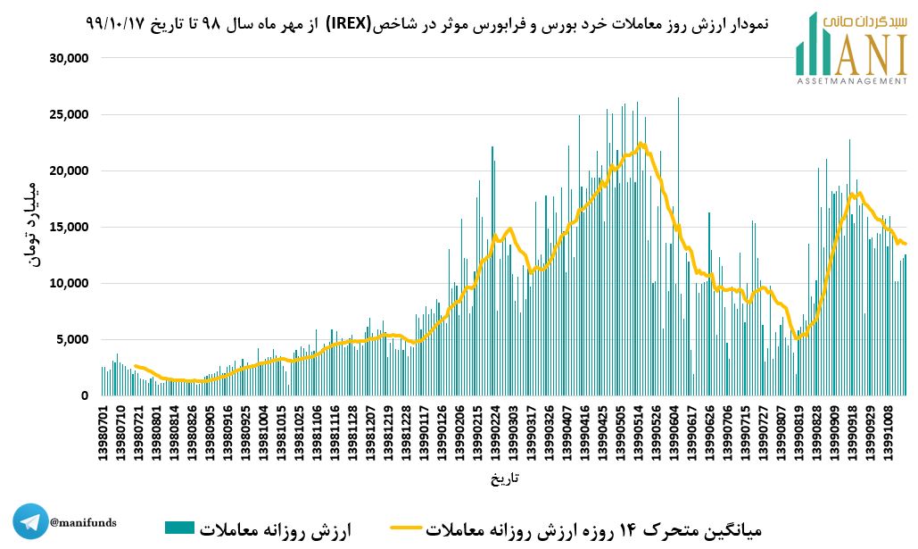 در پایان روز معاملاتی 99/10/17 ارزش معاملات خرد سهام در بورس و فرابورس موثر در شاخص(IREX)، حدود 12،586 میلیارد تومان و میانگین 14 روز گذشته این شاخص حدود 13،501 میلیارد تومان بوده است.