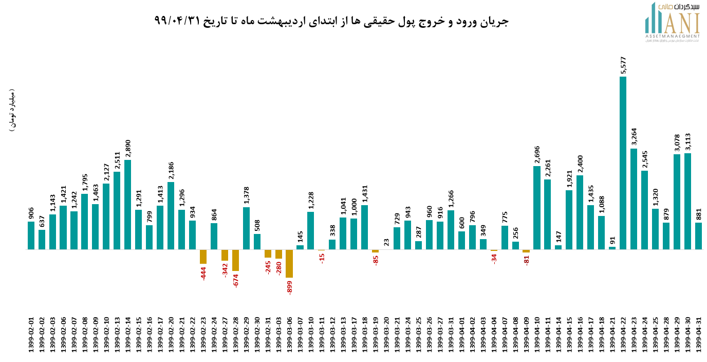 در پایان روز معاملاتی 99/04/31 خالص جریان ورود و خروج پول حقیقی ها حدود مثبت 881 میلیارد تومان می باشد.جریان ورود و خروج در تیر ماه امسال حدود 35,352 میلیارد تومان بوده است همچنین جریان ورود و خروج در خرداد ماه امسال حدود 9,027 میلیارد تومان بوده است.خالص جریان ورود و خرج پول حقیقی ها به بورس در اردیبهشت ماه امسال حدود 25,099 میلیارد تومان بوده است.