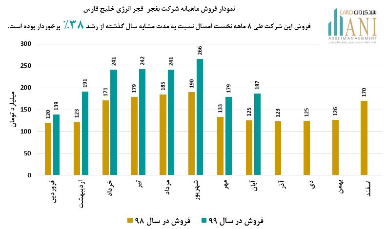 مبلغ فروش شرکت فجر انرژی خلیج فارس طی 8 ماه ابتدایی سال 1399 حدود 1،686 میلیارد تومان بوده که نسبت به دوره مشابه سال گذشته ( 1،226 میلیارد تومان ) از رشد حدود 38% برخوردار بوده است.