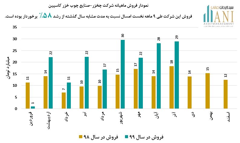 مبلغ فروش شرکت صنایع چوب خزر کاسپین طی 9 ماه ابتدایی سال 1399 حدود 182 میلیارد تومان بوده که نسبت به دوره مشابه سال گذشته ( 116 میلیارد تومان ) از رشد حدود 58% برخوردار بوده است.