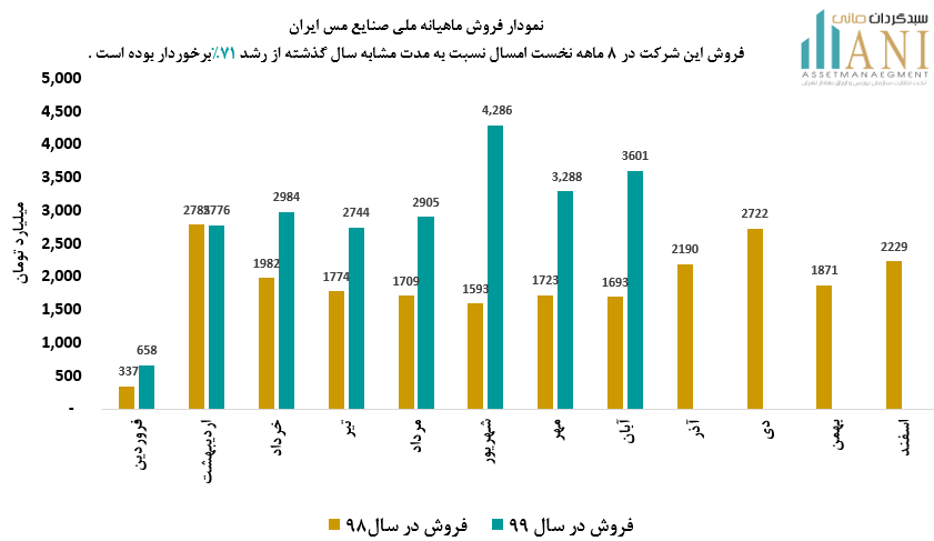 مبلغ فروش شرکت مس ایران طی 8 ماه ابتدایی سال 1399 حدود 23،243 میلیارد تومان بوده که نسبت به دوره مشابه سال گذشته ( 13،596 میلیارد تومان ) از رشد حدود 71% برخوردار بوده است.