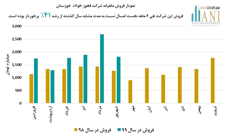 شرکت فولاد خوزستان در سال 98 حدود 15،841 میلیارد تومان فروش داشته است. مبلغ فروش این شرکت طی 6 ماه ابتدایی امسال حدود 11،212 میلیارد تومان بوده که نسبت به دوره مشابه سال گذشته ( 7،947 میلیارد تومان ) از رشد حدود 41% برخوردار بوده است.