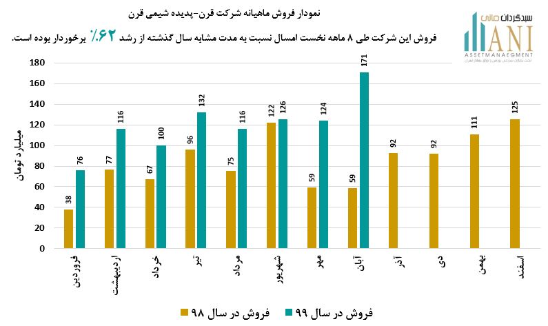 مبلغ فروش شرکت پدیده شیمی قرن طی 8 ماه ابتدایی سال 1399 حدود 962 میلیارد تومان بوده که نسبت به دوره مشابه سال گذشته ( 592 میلیارد تومان ) از رشد حدود 62% برخوردار بوده است.