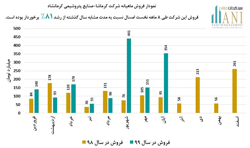 مبلغ فروش شرکت صنایع پتروشیمی کرمانشاه طی 8 ماه ابتدایی سال 1399 حدود 1،493 میلیارد تومان بوده که نسبت به دوره مشابه سال گذشته ( 826 میلیارد تومان ) از رشد حدود 81% برخوردار بوده است.