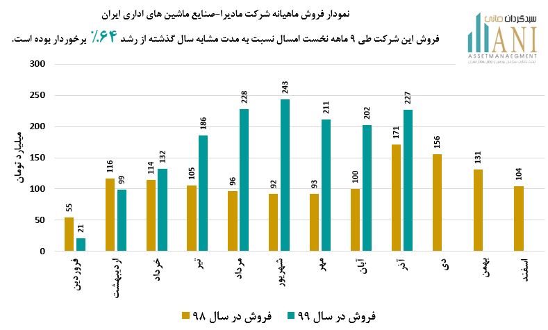 مبلغ فروش شرکت صنایع ماشین های اداری ایران طی 9 ماه ابتدایی سال 1399 حدود 1،550 میلیارد تومان بوده که نسبت به دوره مشابه سال گذشته ( 943 میلیارد تومان ) از رشد حدود 64% برخوردار بوده است.