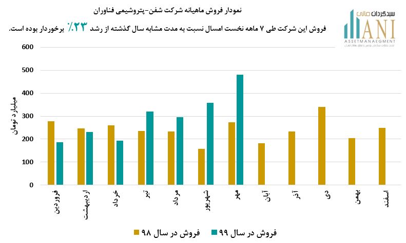 شرکت پتروشیمی فناوران در سال 98 حدود 2،895 میلیارد تومان فروش داشته است. مبلغ فروش این شرکت در مهر ماه امسال حدود 480 میلیارد تومان بوده که نسبت به دوره مشابه سال گذشته ( 274 میلیارد تومان ) از رشد حدود 75% برخوردار بوده است.