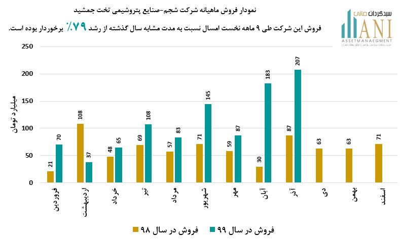 مبلغ فروش شرکت صنایع پتروشیمی تخت جمشید طی 9 ماه ابتدایی سال 1399 حدود 985 میلیارد تومان بوده که نسبت به دوره مشابه سال گذشته ( 549 میلیارد تومان ) از رشد حدود 79% برخوردار بوده است.