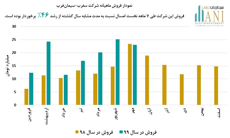 شرکت سیمان غرب در سال 98 حدود 167 میلیارد تومان فروش داشته است. مبلغ فروش این شرکت در مهر ماه امسال حدود 23 میلیارد تومان بوده که نسبت به دوره مشابه سال گذشته ( 23.34 میلیارد تومان ) از رشد حدود 1% کاهش داشته است.