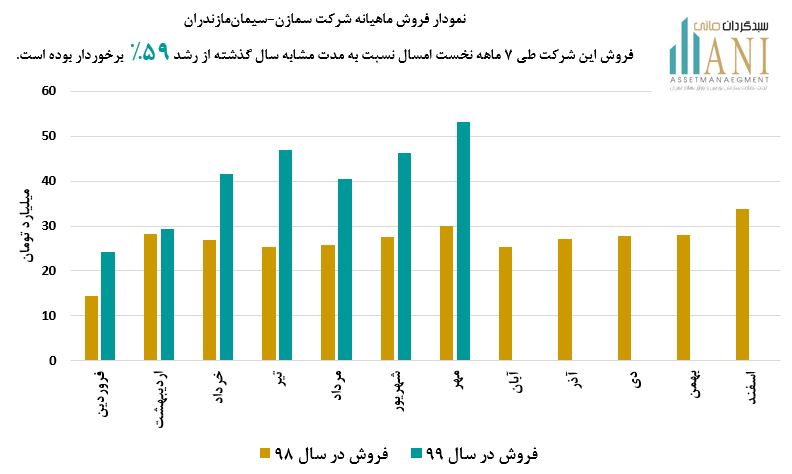 شرکت سیمان مازندران در سال 98 حدود 320 میلیارد تومان فروش داشته است. مبلغ فروش این شرکت در مهر ماه امسال حدود 53 میلیارد تومان بوده که نسبت به دوره مشابه سال گذشته ( 30 میلیارد تومان ) از رشد حدود 77% برخوردار بوده است.