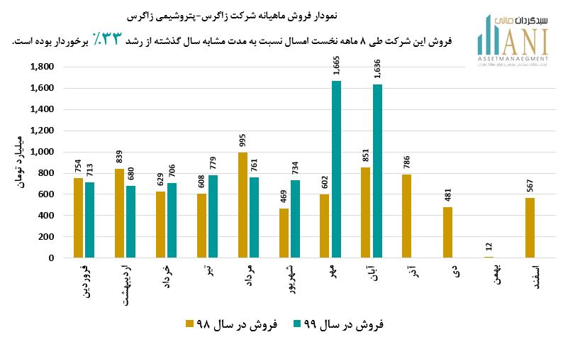 مبلغ فروش شرکت پتروشیمی زاگرس طی 8 ماه ابتدایی سال 1399 حدود 7،673 میلیارد تومان بوده که نسبت به دوره مشابه سال گذشته ( 5،748 میلیارد تومان ) از رشد حدود 33% برخوردار بوده است.