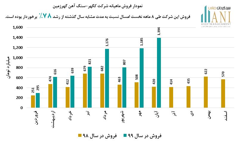 مبلغ فروش شرکت سنگ آهن گهرزمین طی 8 ماه ابتدایی سال 1399 حدود 6،932 میلیارد تومان بوده که نسبت به دوره مشابه سال گذشته ( 3،890 میلیارد تومان ) از رشد حدود 78% برخوردار بوده است.