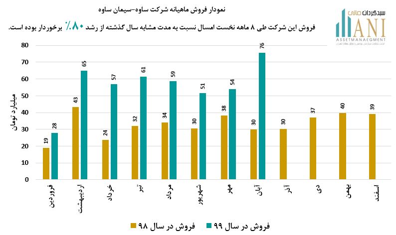 مبلغ فروش شرکت سیمان ساوه طی 8 ماه ابتدایی سال 1399 حدود 451 میلیارد تومان بوده که نسبت به دوره مشابه سال گذشته ( 250 میلیارد تومان ) از رشد حدود 80% برخوردار بوده است.