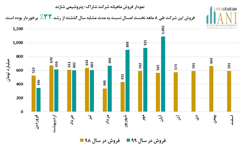 مبلغ فروش شرکت پتروشیمی شازند طی 8 ماه ابتدایی سال 1399 حدود 5،749 میلیارد تومان بوده که نسبت به دوره مشابه سال گذشته ( 4،366 میلیارد تومان ) از رشد حدود 32% برخوردار بوده است.
