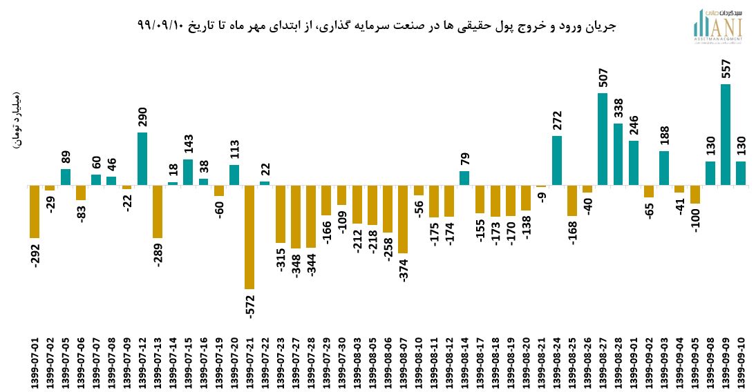 خالص ورود پول حقیقی به صنعت سرمایه گذاری در پایان روز معاملاتی 99/09/10 حدود 130 میلیارد تومان بوده است.
