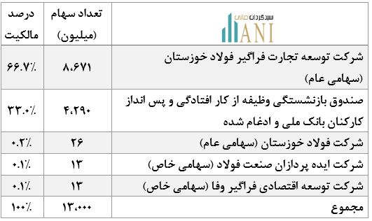 لازم به ذکر است که بانک ملی به عنوان بانک عامل و تامین کننده سرمایه و شرکت سرمایه گذاری گروه توسعه ملی (سهامی عام) به عنوان سرمایه گذار در پروژه های شرکت صنعتی و معدنی توسعه ملی (سهامی خاص) مشارکت داشتند که در راستای اصل خصوصی سازی و خروج بانک ها از بنگاهداری، این شرکت در اسفند ماه سال ۱۳۹۶ به شرکت فولاد خوزستان (سهامی عام) واگذار گردید و نام شرکت به شرکت صنعتی و معدنی توسعه فراگیر سناباد تغییر کرد.