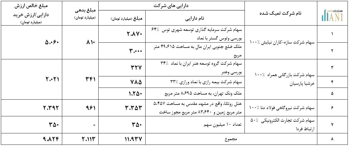 پیرو افشائیات مورخ 1399/05/25، مبنی بر تسویه تسهیلات سنواتی، به مبلغ 13،100 میلیارد تومان، از محل تملیک اموال و سهام شرکت ها، که جزئیات مربوط به تسویه 3،300 میلیارد تومان آن مورخ 1399/05/21 افشا شده است؛ جزئیات مابقی آن، در حدود 9،800 میلیارد تومان، به شرح جدول بالا به استحضار می رسد.
