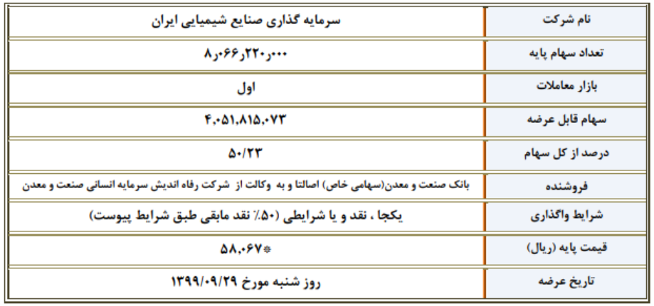 بانک صنعت و معدن در نظر دارد تا تعداد 4،051،815،073 سهم معادل 50.23 درصد سهام شرکت سرمایه گذاری صنایع شیمیایی ایران با لحاظ آخرین افزایش سرمایه و به قیمت پایه 58،067 ریال شرکت با نماد بورسی ” شیران ” را از طریق بورس و اوراق بهادار تهران بطور یکجا و نقد و یا نقد و اقساط و بالاترین قیمت پیشنهادی واگذار نماید .