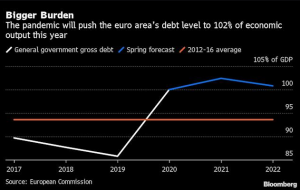 کمیسیون اروپا در ادامه پیش بینی کرده است که بدهی کشورهای منطقه یورو امسال به بیش از 102.4 درصد تولید ناخالص داخلی خواهد رسید. این رقم سال گذشته به 100 درصد رسیده بود. بدهی کشورهای عضو یورو در سال 2022 نیز به 100.8 درصد تولید ناخالص داخلی می رسد.