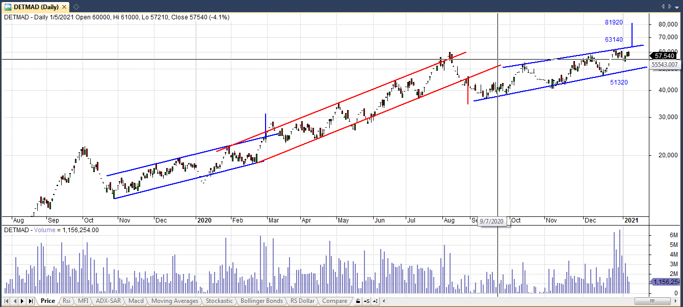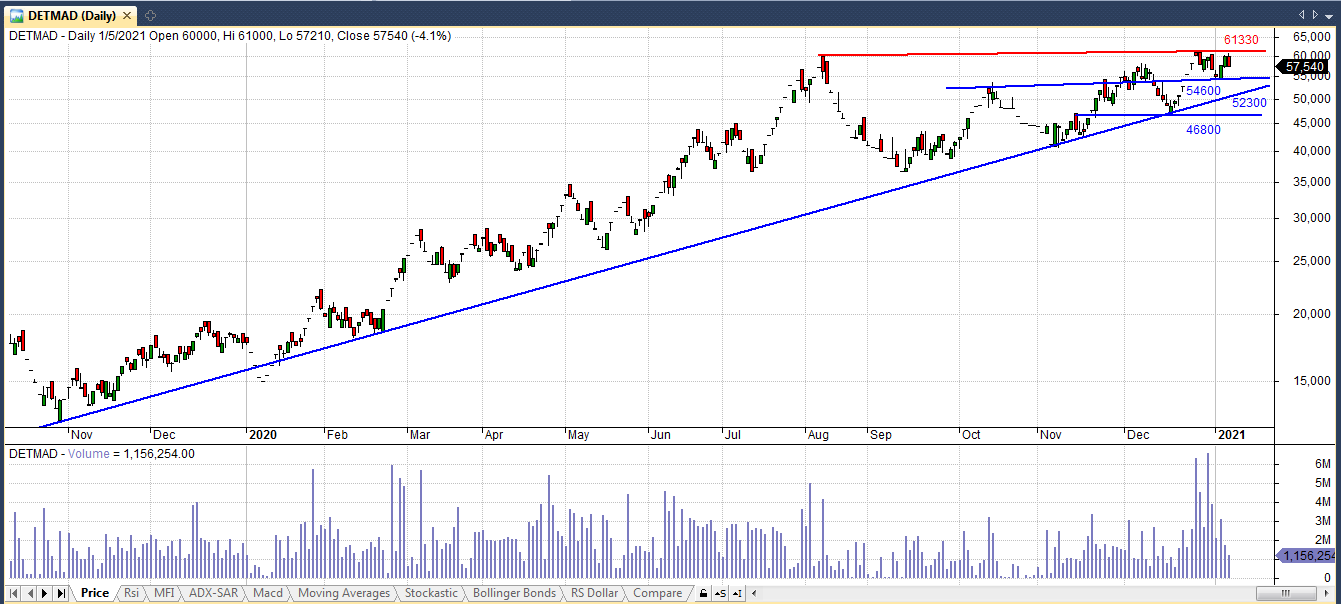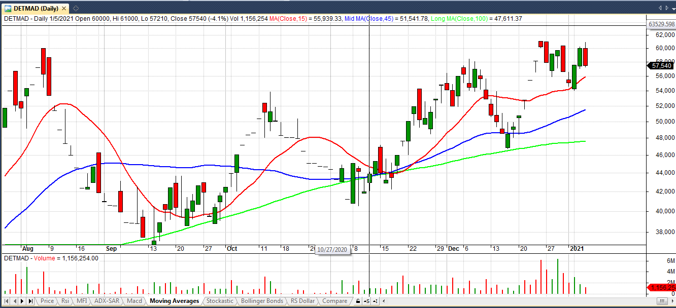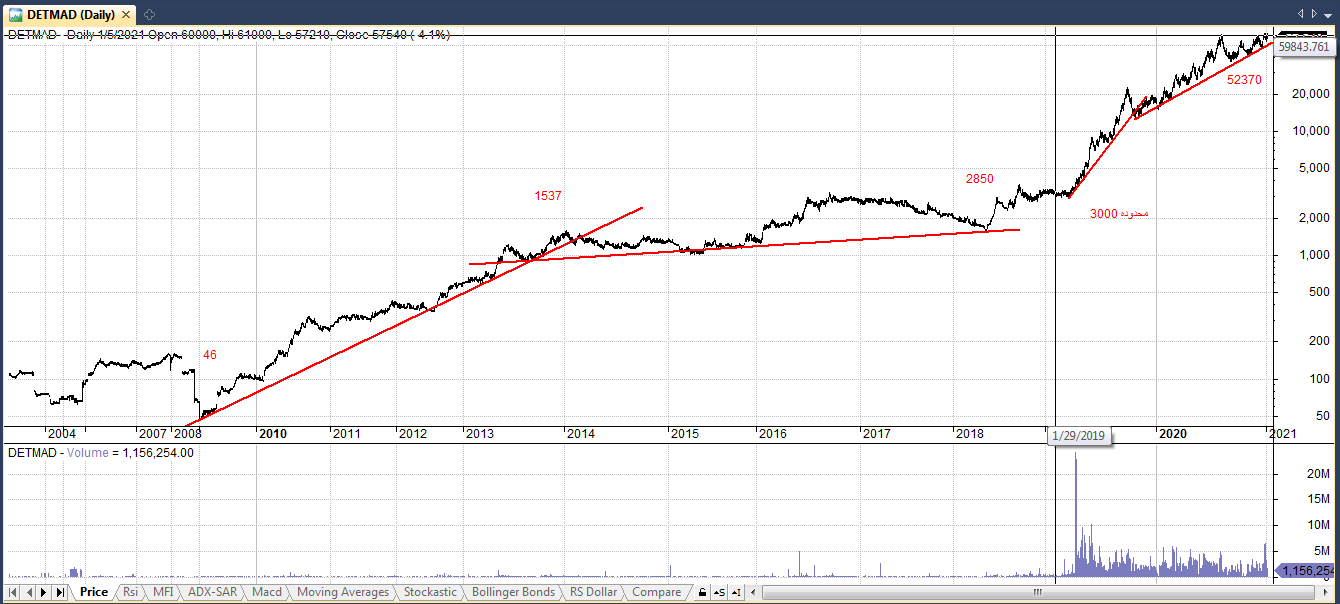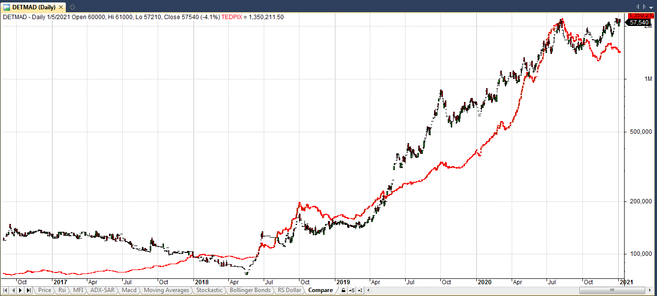 سهام دتماد از اواخر سال 1381 در بازار سرمایه پذیرفته شد و به طور کلی در 4 فاز حرکتی قرار داشته . در ابتدا در یک روند صعودی 5 ساله حرکت کرده و طی این مدت 3241 درصد رشد نمود سپس در فاز دوم حرکتخودکهآنهم5سالبوده 88درصدرشدکردهوسپسازفروردین98تااواسطمهرماه98رشد 530 درصدی داشت و از اوایل آبان ماه 98 تا به امروز در یک روند صعودی با شیب ماهانه مثبت 10 درصد در حال حرکت است و از قیمت 12730 به 57540 ریال رسیده که حدود 311 درصد رشد را نشان می دهد.