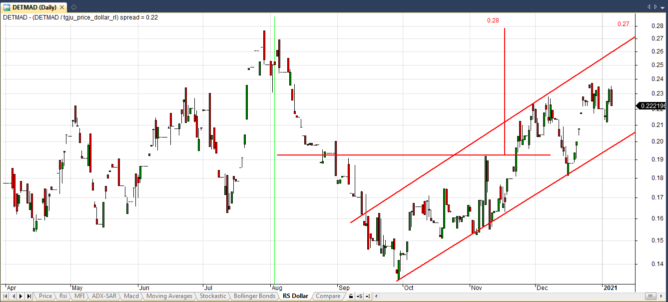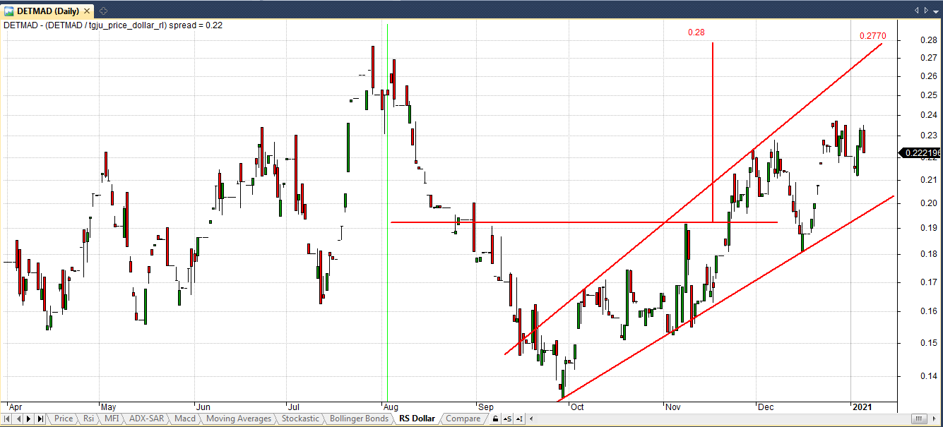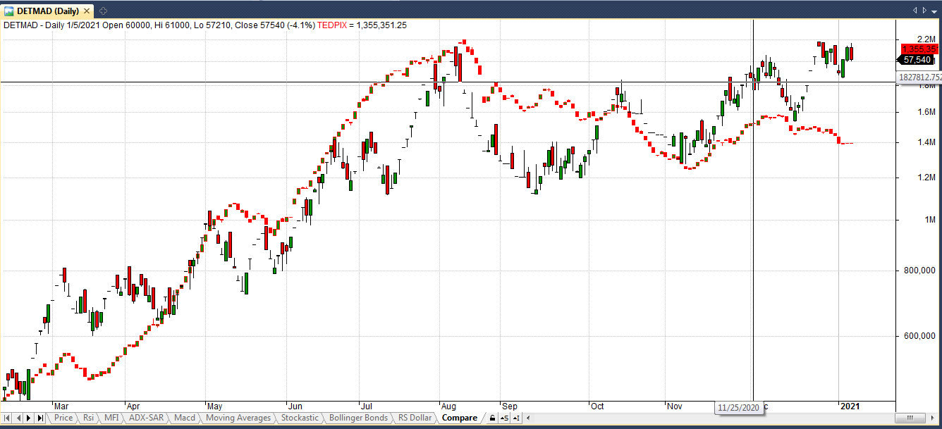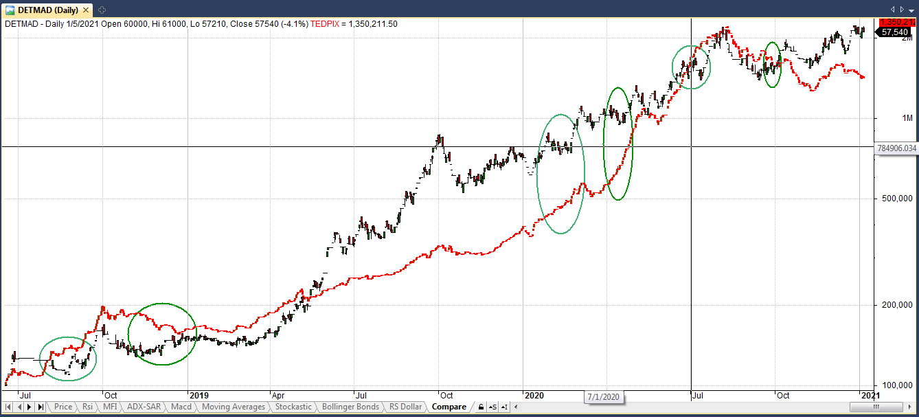 راستای حرکت شاخص کل و سهام دتماد طی سالهای گذشته یکسان بوده، اما از تاریخ 99/09/26 تا به امروز جهت حرکت آنها نسبت به یکدیگر تغییر کرده و شاخص کل رو به کاهش بوده در حالیکه سهام دتماد رشد نموده است . اما با توجه به تاریخچه این دو نمودار انتظار می رود، قیمت سهام دتماد نیز با تاخیر زمانیکاهش یابد و در راستای شاخص کل قرار گیرد.