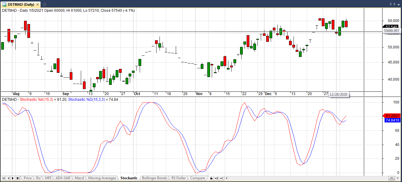Stockastic: شکست خط D توسط خط K و حرکت هر دو نمودار به سمت محدوده 80 .