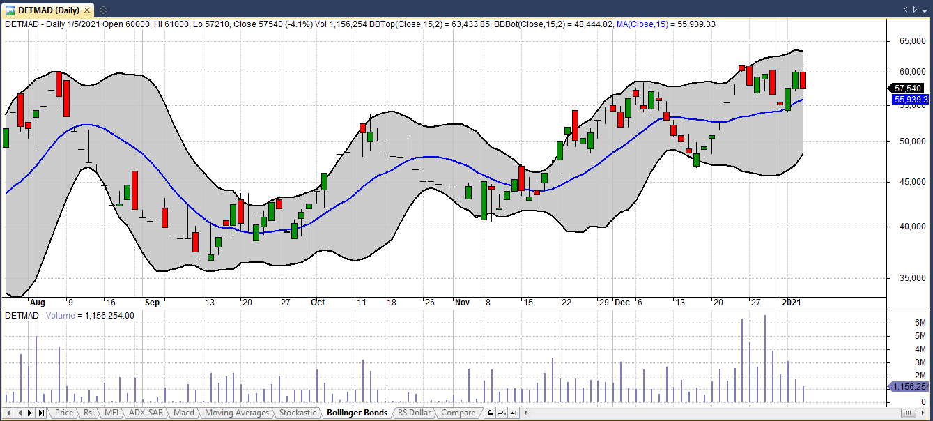 Bollinger Bonds : فاصله گرفتن قیمت از منتهی الیه سطح بالایی باند، احتمال برگشت روند را نشان می دهد.