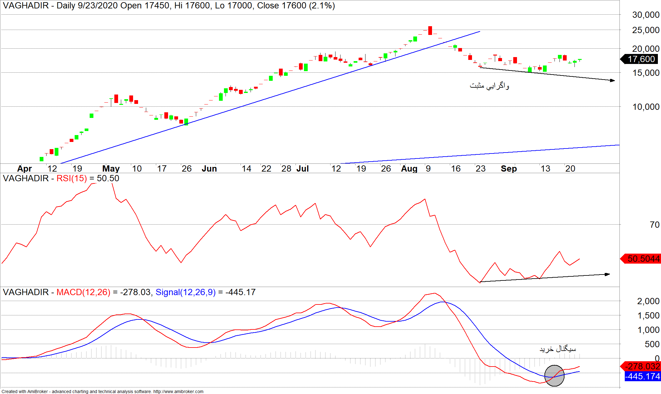 در سرمایهگذاری غدیر بین نمودار قیمت و RSI واگرایی مثبت مشاهده می شود، که نشان از کاهش قدرت روند نزولی و تمایل به برگشت رو به بالا دارد، همچنین اندیکاتور MACD سیگنال خرید صادر نموده است.