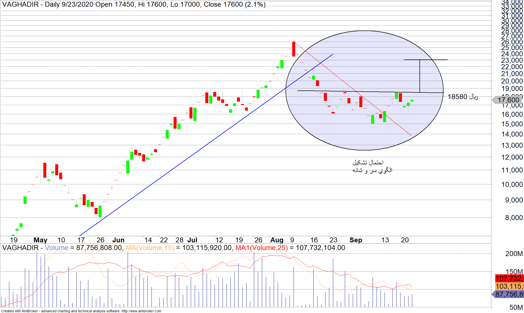 در صورت عبور از محدوده 18580 ريال، الگوی سر و شانه که یک الگوی برگشتی است، تکمیل می گردد. لازم به ذکر است که این سهم همبستگی بالایی با شاخص کل و شرایط کلی بازار دارد.