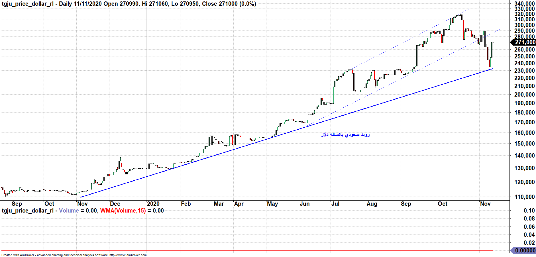 این روند صعودی روند قوی است چون از تعداد تماس بالایی برخوردار می باشد. با توجه به این روند، به نظر نمی رسد شاهد افت قیمت دلار به زیر 23.000 تومان باشیم.