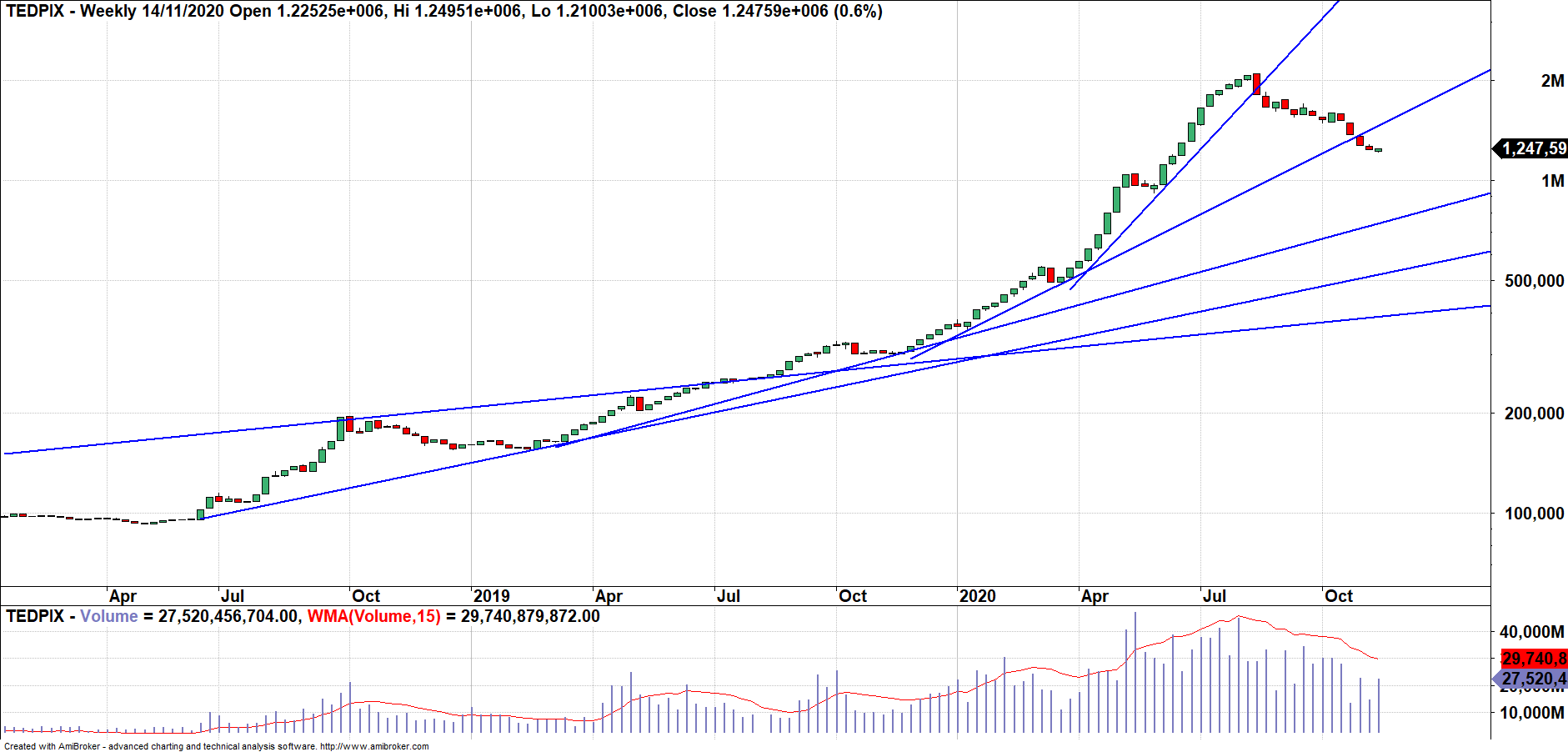 بعد از آن افت بازار آغاز شد و پس از آن روندهای صعودی بازار یکی پس از دیگری شکسته شدند (2 روند از 4 روند اصلی) که در تصویر زیر مشاهده می شود.