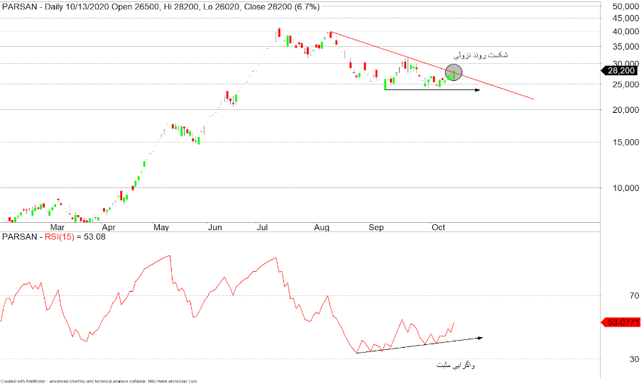همانطور که مشاهده می شود، بین نمودار قیمت و شاخص RSI واگرایی مثبت مشاهده می شود و روند نزولی بهمراه افزایش حجم معاملات در حال شکست می باشد.