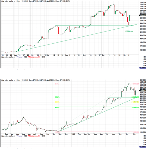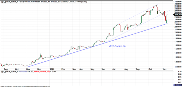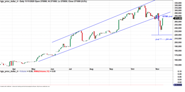 همانطور که در تصویر زیر مشاهده می شود همزمان با اعلام نتایج انتخابات آمریکا، کانال صعودی دلار به پایین شکسته شد و در 27780 تومان هدف قیمتی 22000 تومان را صادر نمود.
