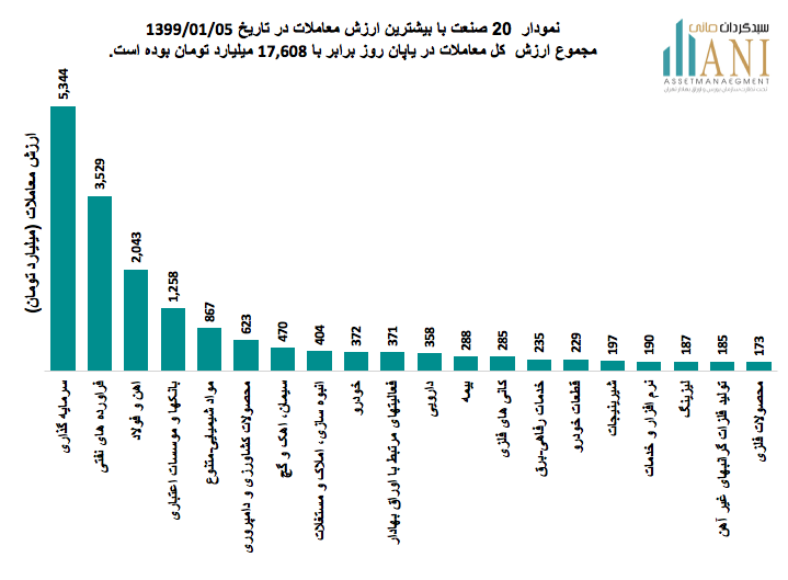 نمودار 20 صنعت با بیشترین ارزش معاملات در تاریخ 1399/05/01، مجموع ارزش کل معاملات در پایان روز برابر با 17,608 میلیارد تومان بوده است. صنایع سرمایه گذاری، فراورده های نفتی، آهن و فولاد، و بانک ها به ترتیب 30%، 20% ، 12% و 7% از ارزش کلی معاملات را به خود اختصاص داده اند.