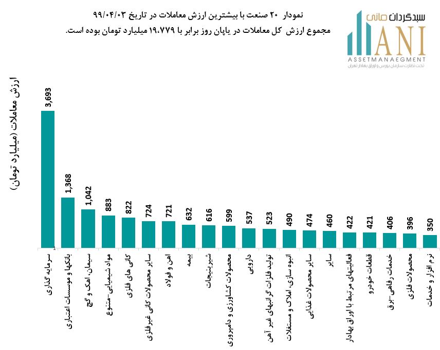 نمودار 20 صنعت با بیشترین ارزش معاملات در تاریخ 1399/04/03 ، مجموع ارزش کل معاملات در پایان روز برابر با 19,779 میلیارد تومان بوده است. صنایع سرمایه گذاری، بانک ها، سیمان،آهک و گچ و مواد شیمیایی به ترتیب  17%، 7% ، 5% و 4%  از ارزش کلی معاملات را به خود اختصاص داده اند.