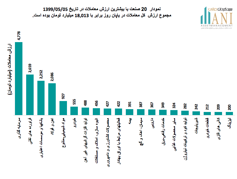 نمودار 20 صنعت با بیشترین ارزش معاملات در تاریخ 1399/05/05، مجموع ارزش کل معاملات در پایان روز برابر با 18,013 میلیارد تومان بوده است. صنایع سرمایه گذاری، فراورده های نفتی،بانک ها و آهن و فولاد به ترتیب 27%، 15% ، 13% و 12% از ارزش کلی معاملات را به خود اختصاص داده اند.